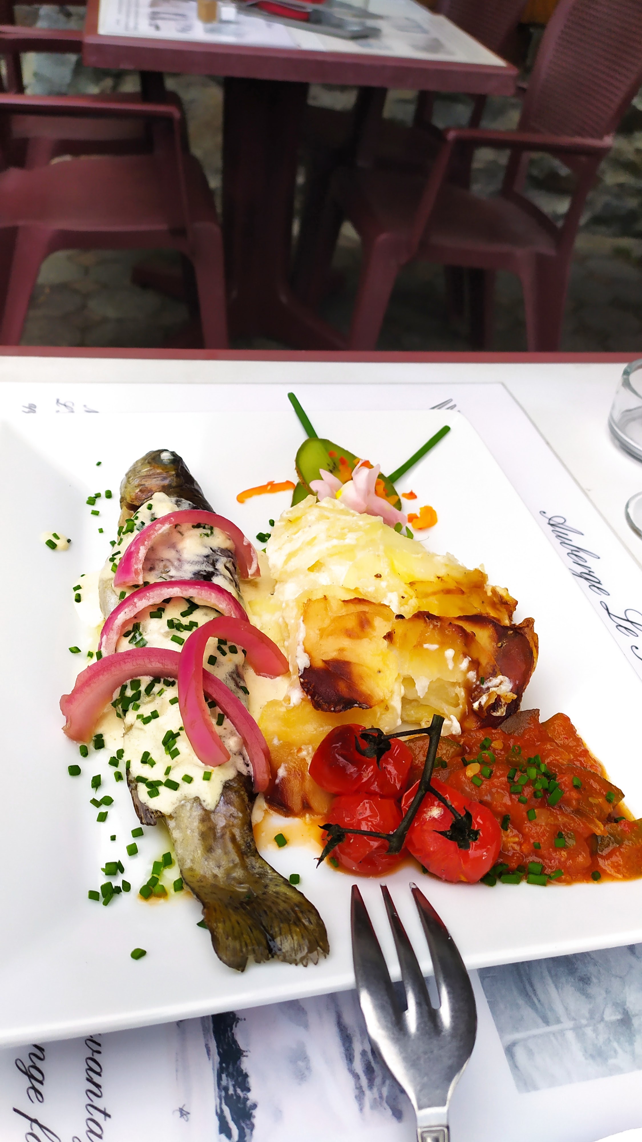 Nous avons eu la chance de pouvoir manger en terrasse, cadre magnifique et très bon repas, le foie gras est succulent ainsi que le filet de truite. Très bon accueil par l'ensemble de l'équipe.