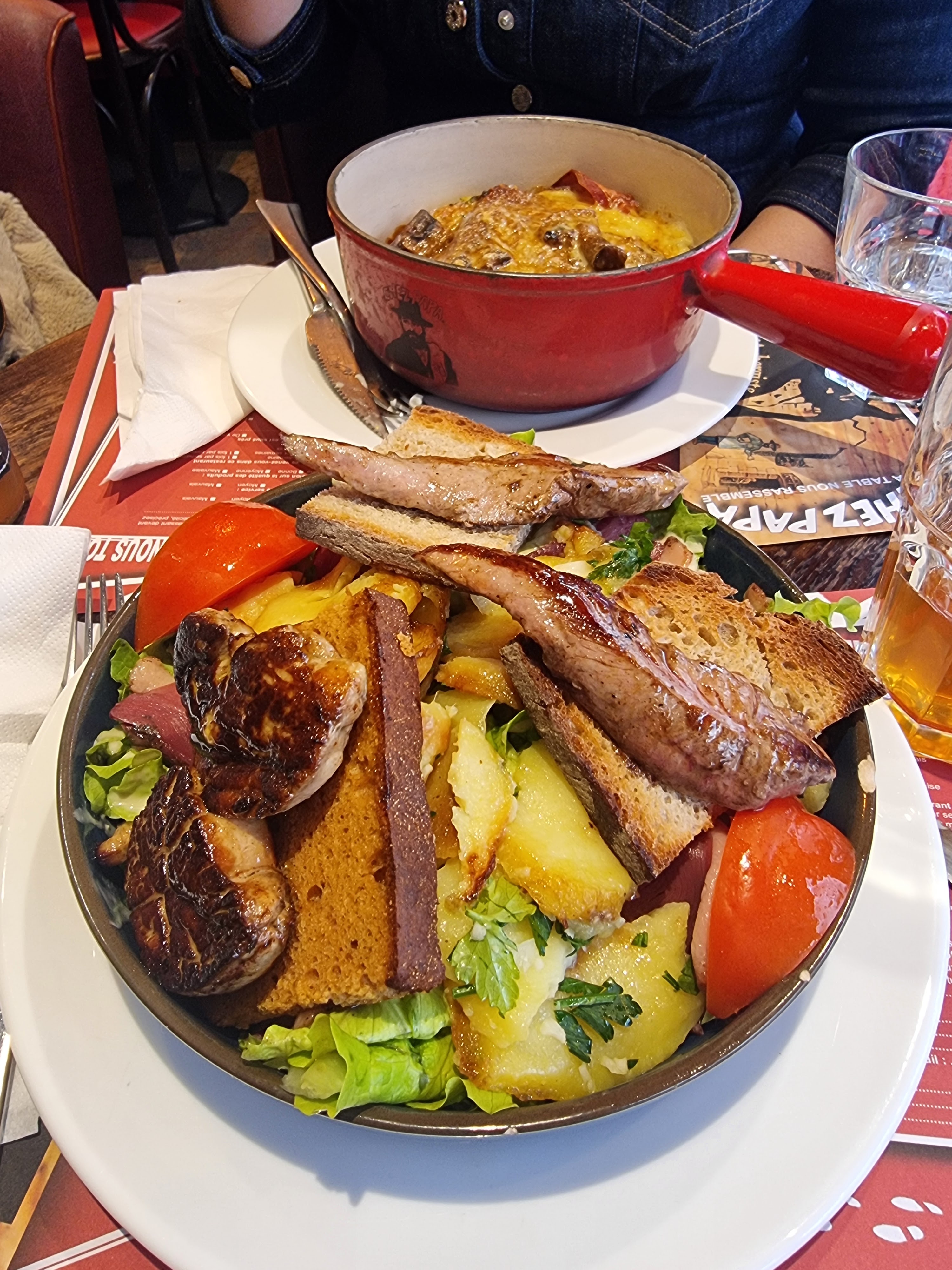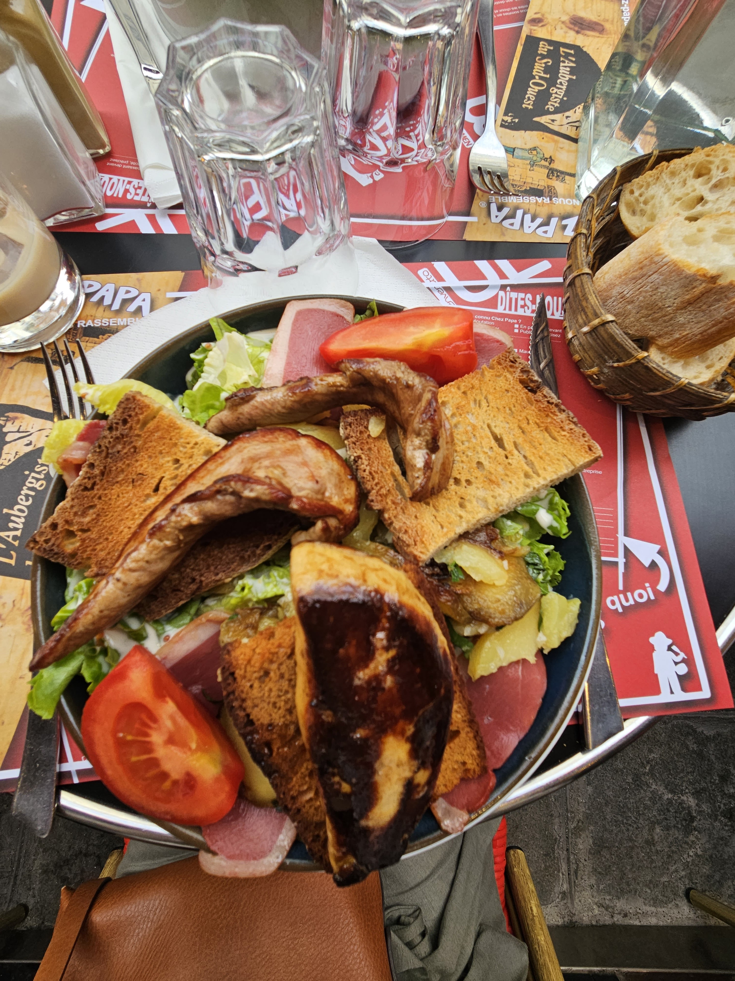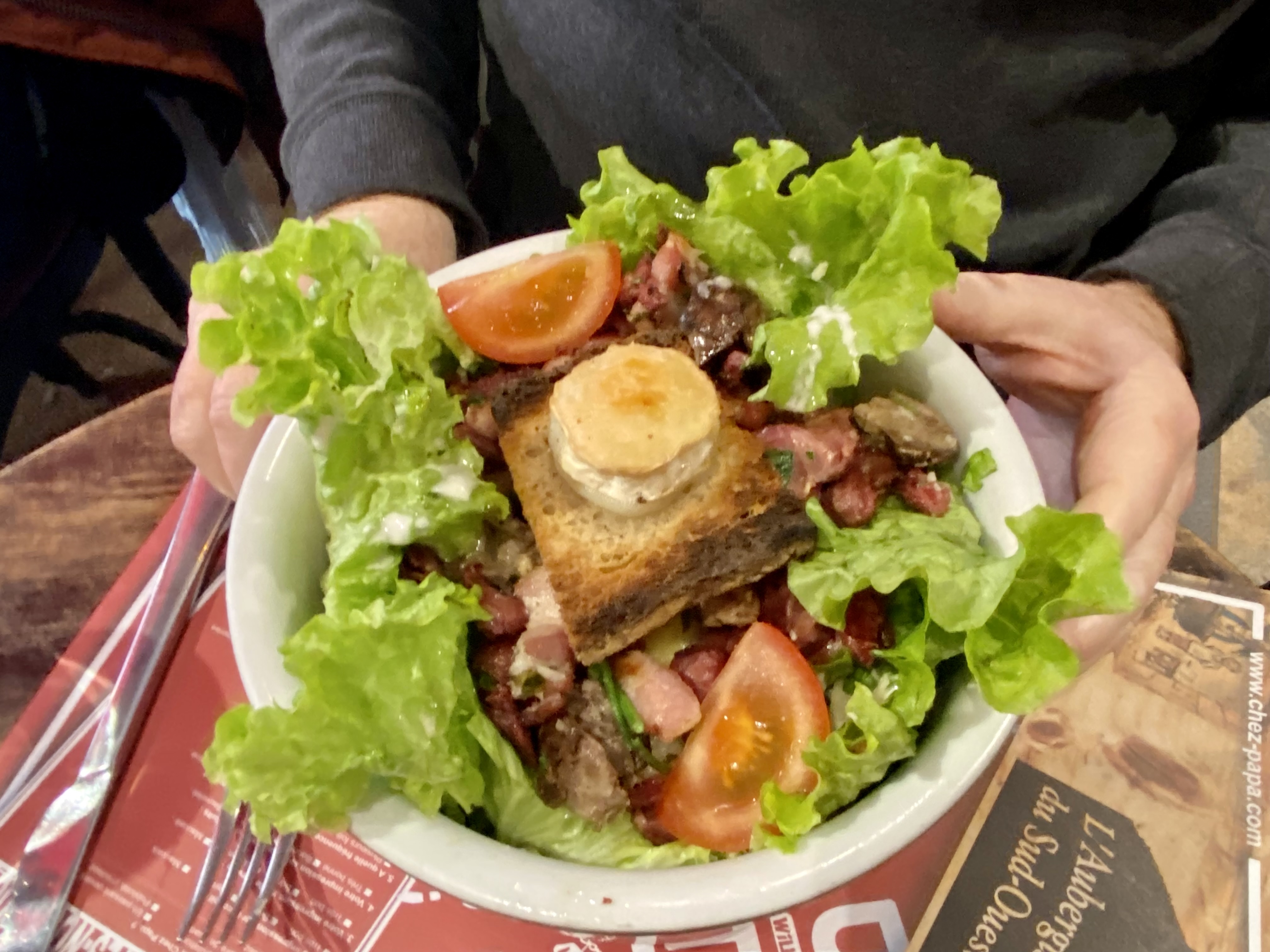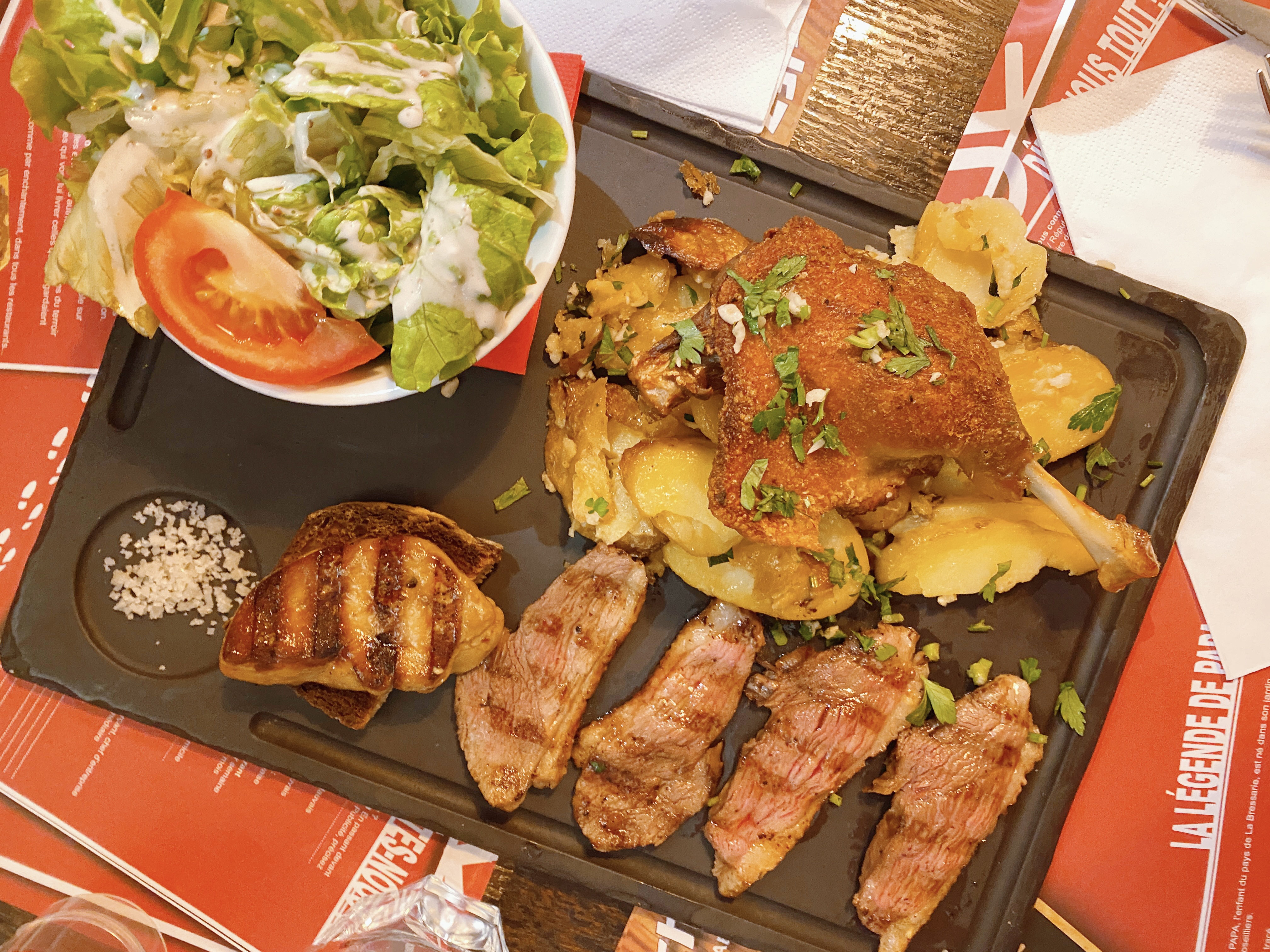 Je suis un fan de la franchise Chez Papa dont le premier que j’ai testé (et mon préféré selon mes souvenirs) était situé rue de La Croix Nivert dans le 15eme arrondissement de Paris. J’ai donc décidé de tester celui ci situé au 59 rue de Clichy et je dois avoir que l’expérience était vraiment pas mal ! Je vous conseil donc de tester cette table si vous êtes dans le coin. J’ai commandé mon classic préféré, mon plat étalon que je prends systématiquement quand je teste un nouveau « chez papa » : la gigantesque salade Super Papa ! Et franchement, la mienne était bonne dans celui ci (ce qui n’est pas le cas dans tous les « chez papa » malheureusement). Ma compagne avait pris la salade de maman avec le foie gras poêlé et les magrets de canard et elle s’est régalée aussi ! Vous verrez si vous y allez, ces salades servies dans des gros saladiers cylindriques sont ENORMES et très copieuses ! Elles compilent toutes les bonnes choses du sud ouest : salade, cantal, pommes de terres à la sarladaise, gésiers et foies de volaille, lardons, et toast au chèvre chaud ! Un plat INCONTOURNABLE ! En dessert je vous conseille la brioche façon pain perdu avec sa boule de glace ou la croustade aux pommes et sa sauce caramel à l’armagnac... Bon appétit 😉 !