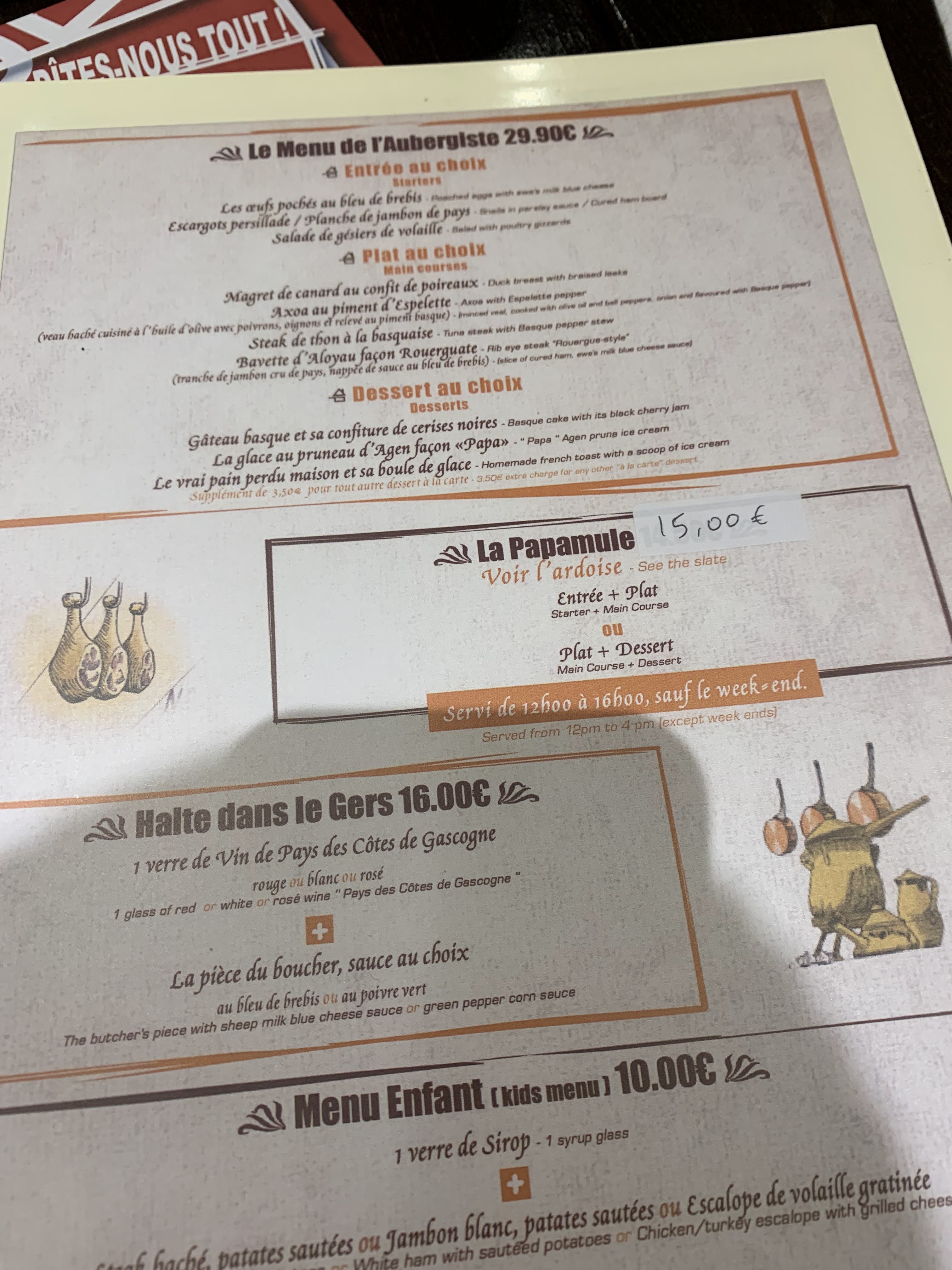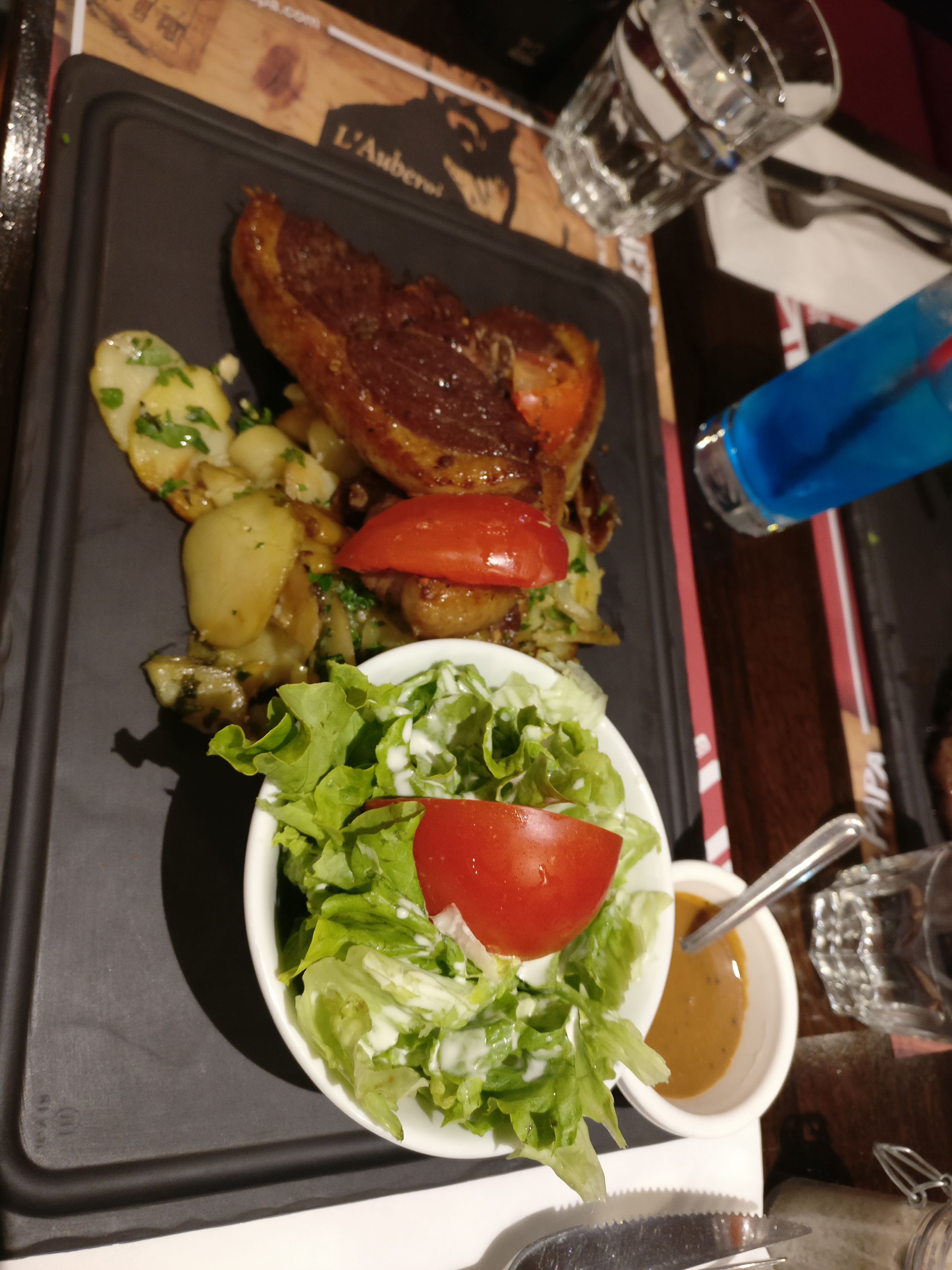 Après une soirée théâtre, c est la que nous nous sommes posés. On a vraiment aimé cette cuisine généreuse. Charcuterie, viande, accompagnement du Sud Ouest, bref un vrai moment de table. Et l accueil vraiment au top. De vrais restaurateurs. Merci à vous pour ce super moment en vos murs. Je conseille fortement