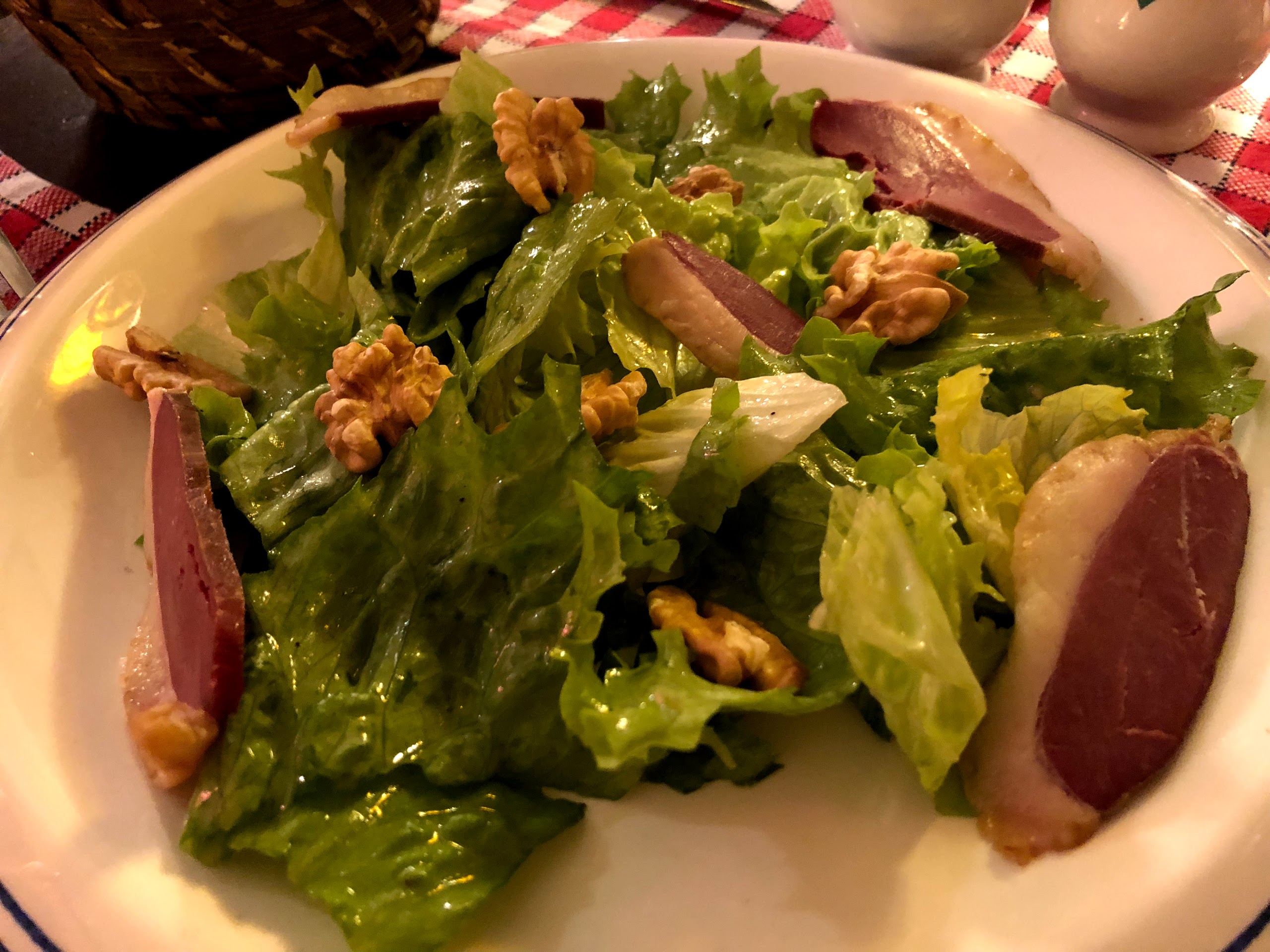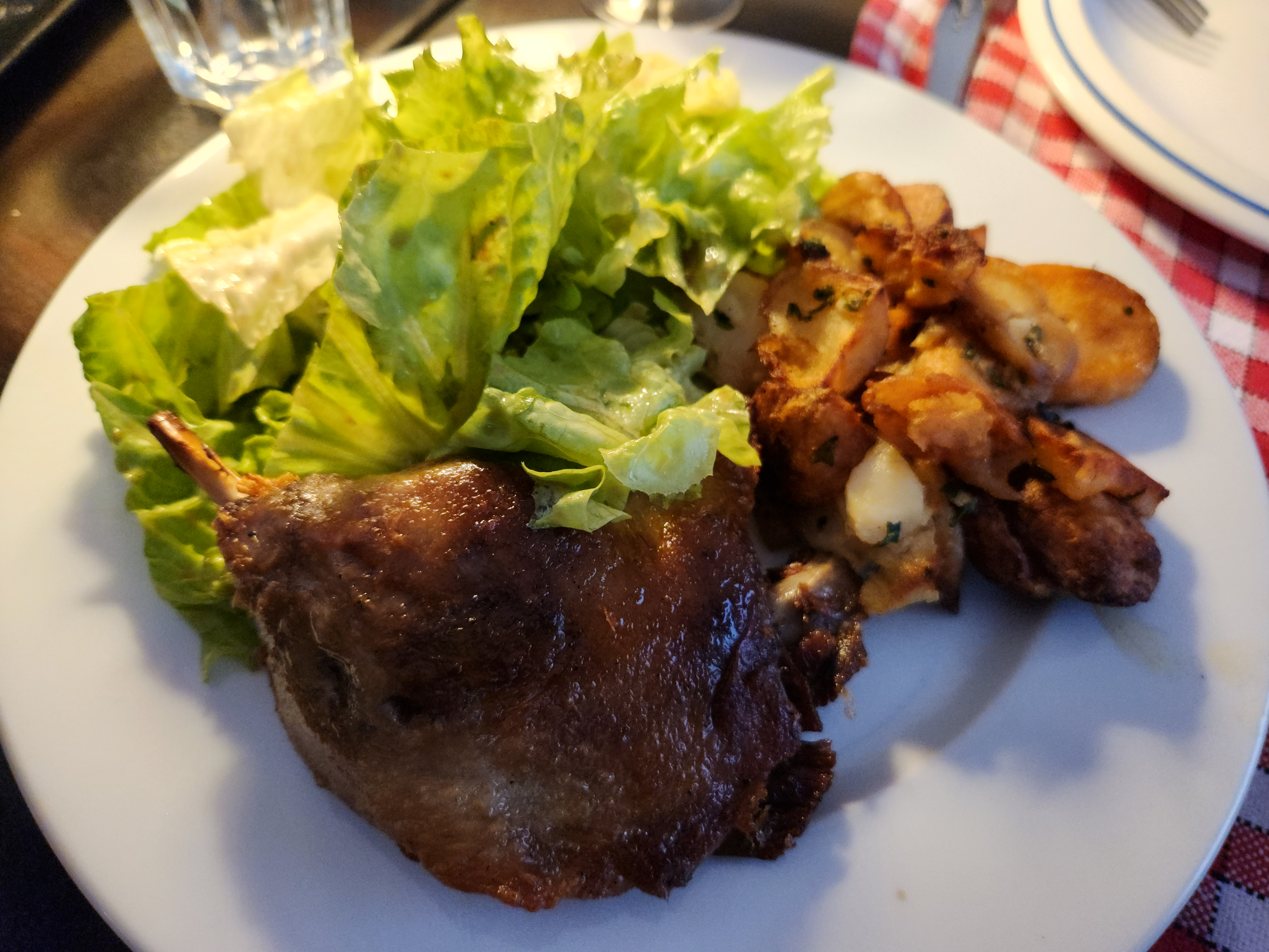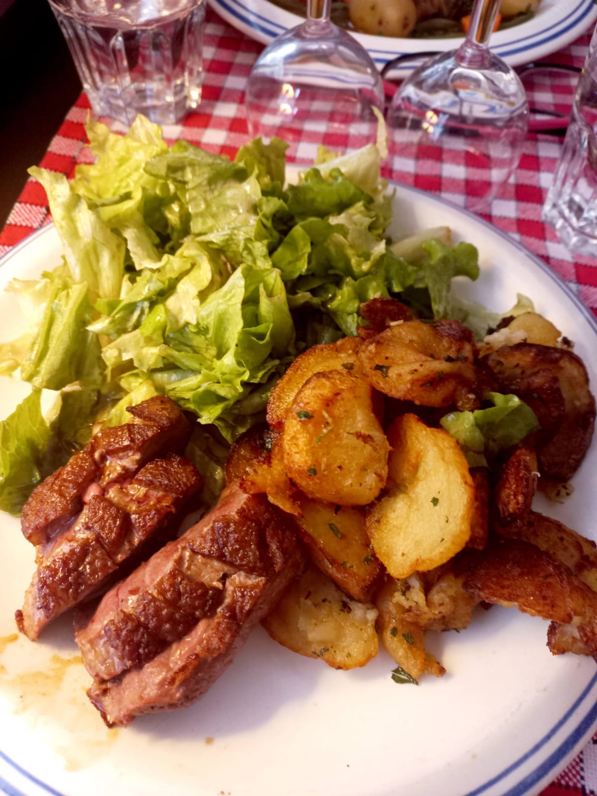La cuisine n’avait rien d’extraordinaire, c’était pas mauvais, mon magret était accompagné de quelques morceaux de pommes de terre et de la salade verte avec de morceaux de tomates « plastiques », alors que nous sommes en saison où il est tout à fait possible de trouver de bonnes tomates. Le service en revanche était déplorable, nous avons attendu longtemps, le serveur (patron?) n’était pas aimable, limite snob. Bref, on s’était dépêché de finir de manger…