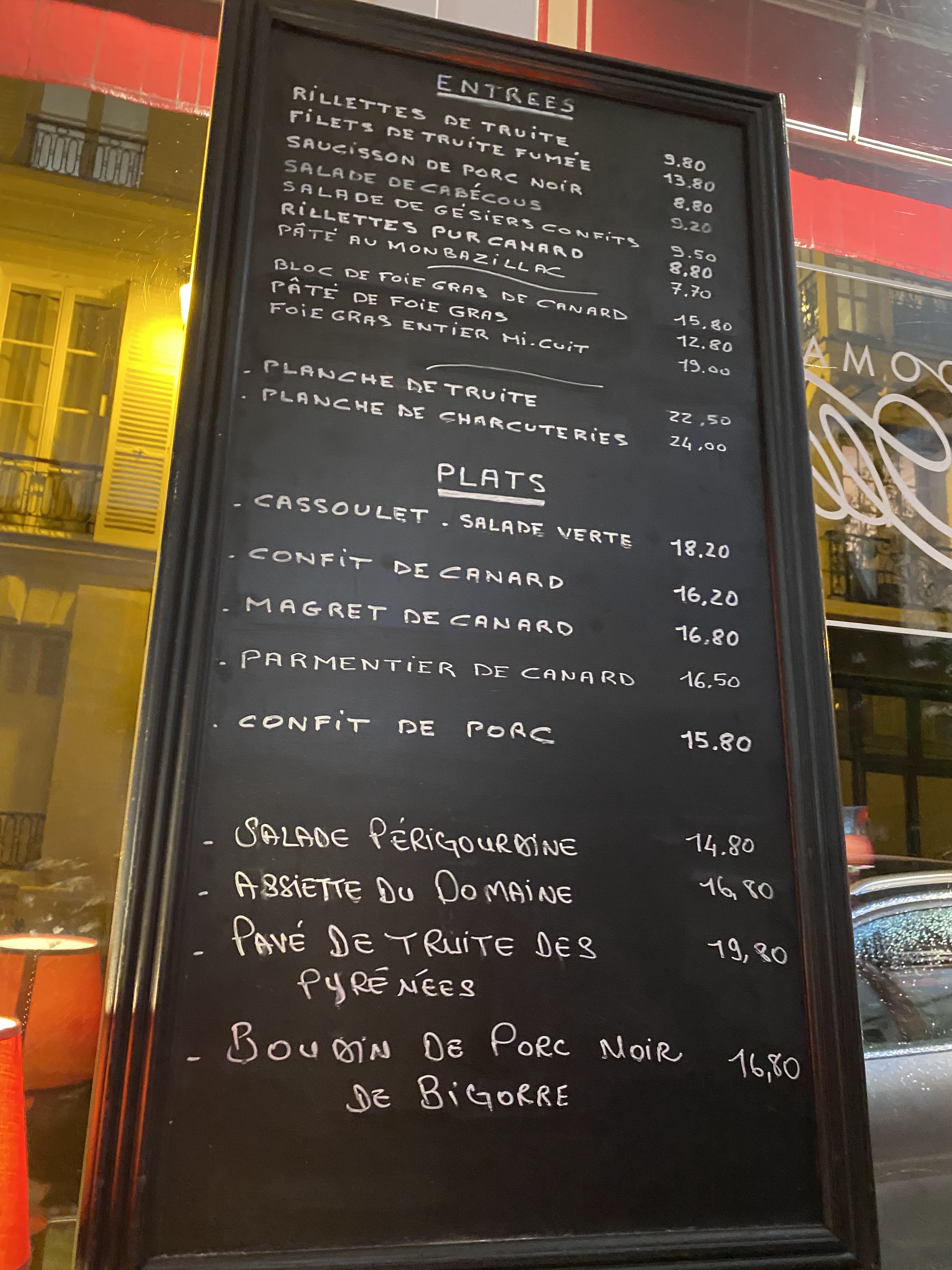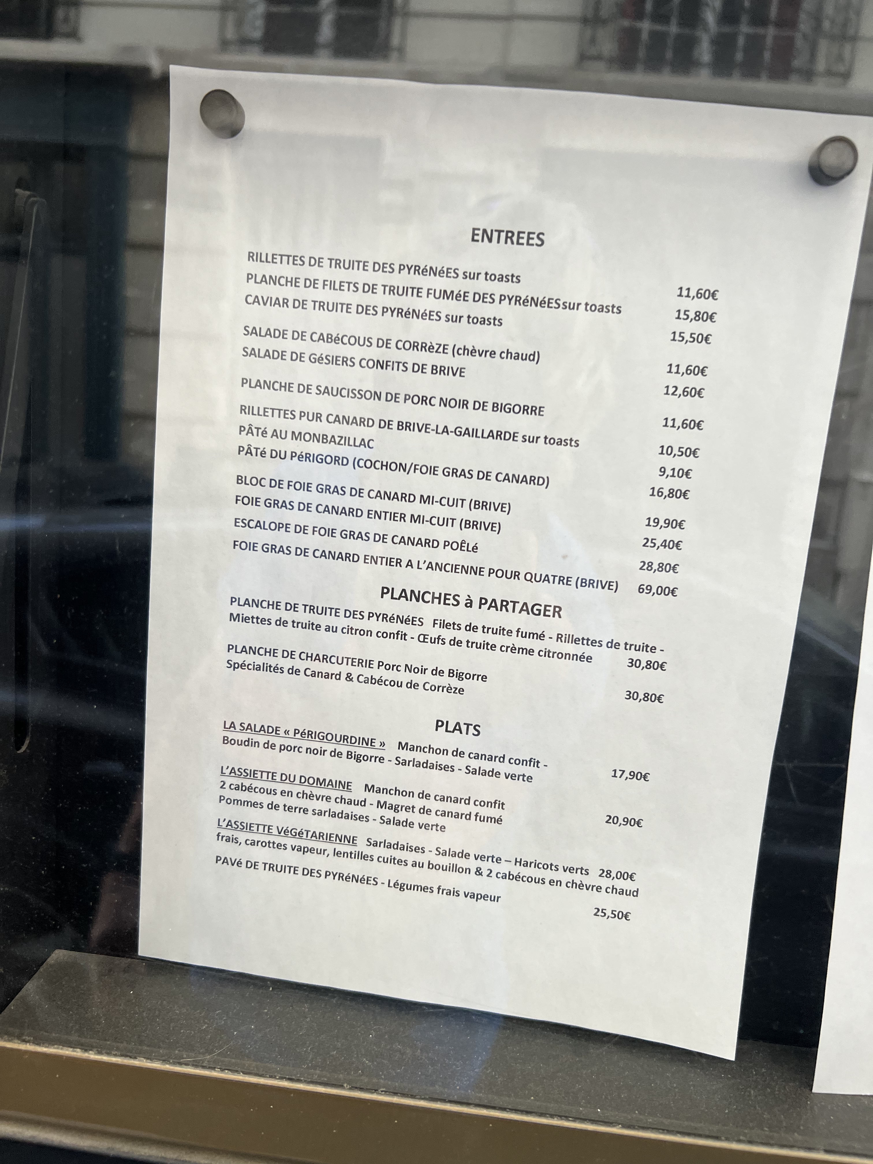 L'ardoise est alléchante. Mais le résultat n'est pas à la hauteur. Les 2 plats servis étaient certainement des boîtes ou bocaux réchauffés. C'est dommage, et on devrait attendre mieux d'un restaurant spécialisé sud-ouest.