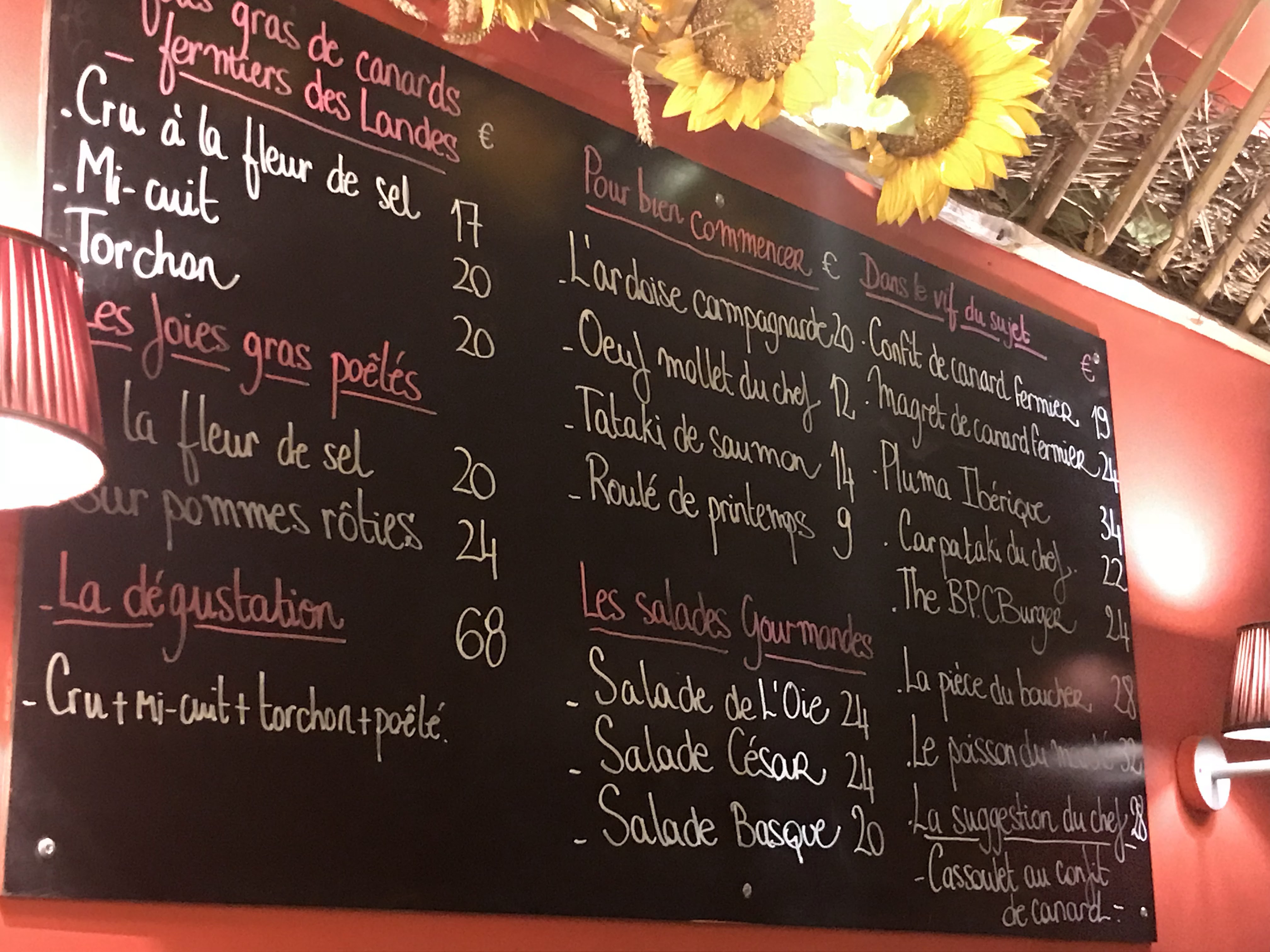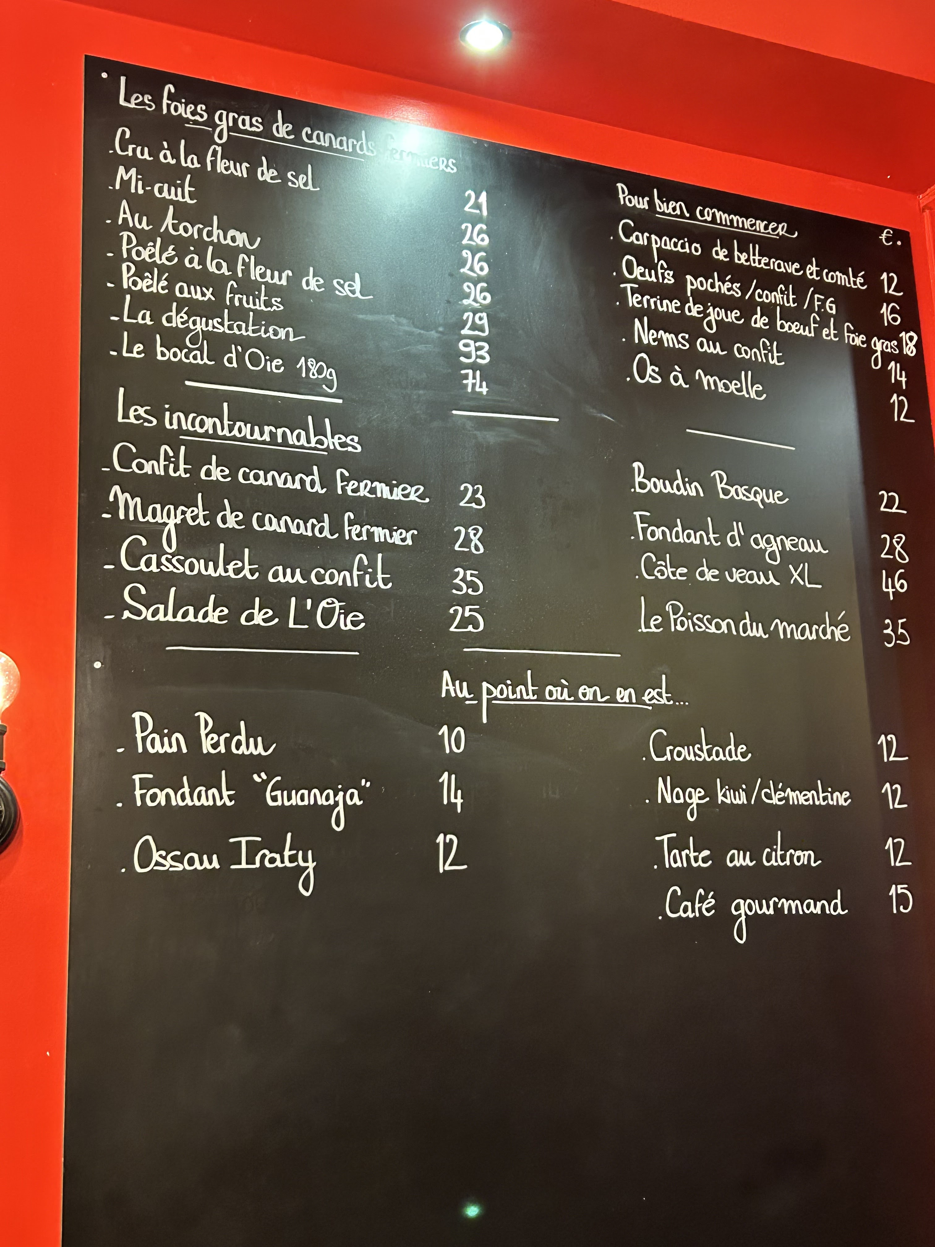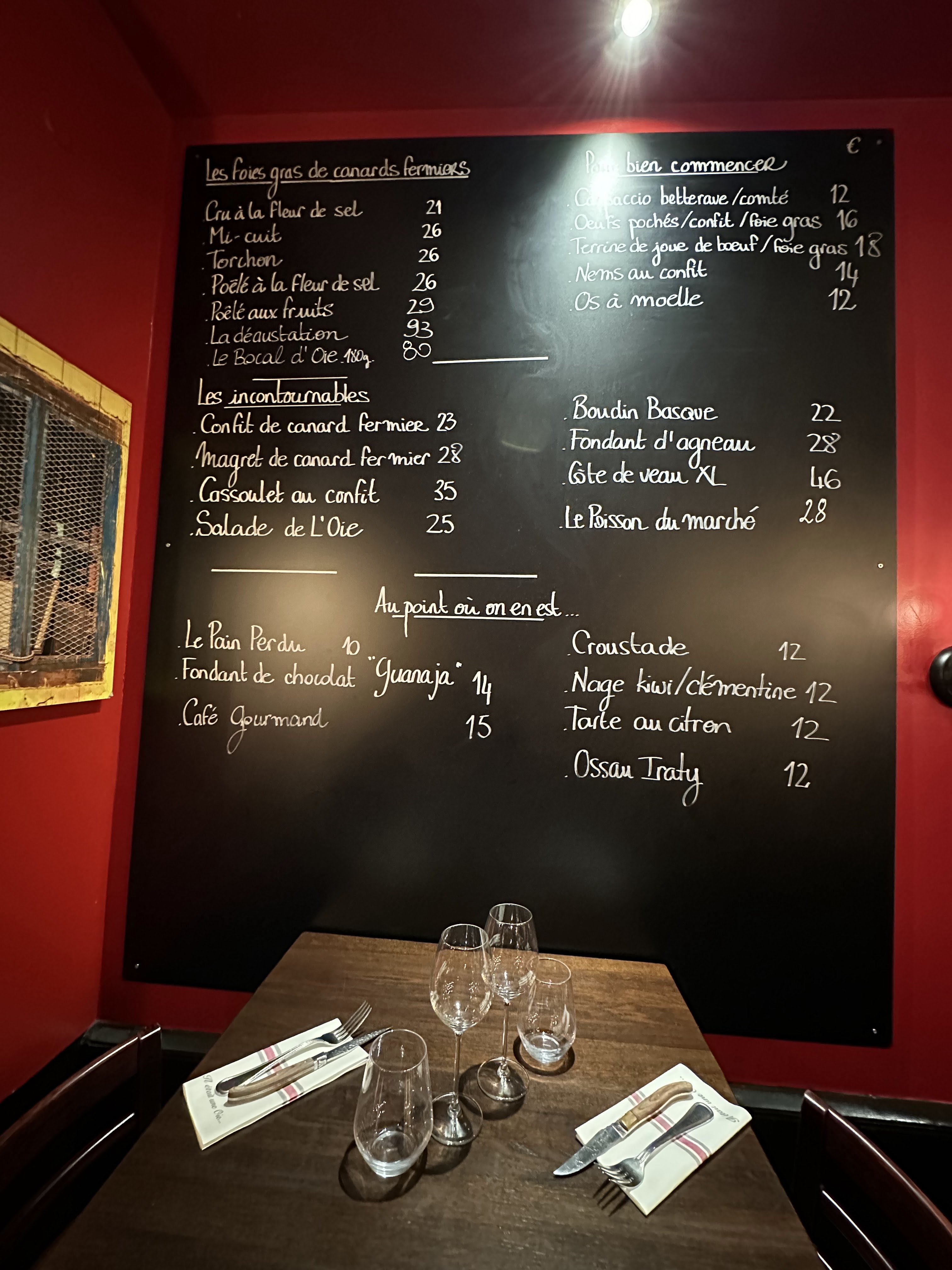 Le petit restaurant proposant les spécialités de Sud-Ouest comme le foie gras (cru, mi-cuit, poêlées), l'os à moelle, le magret de canard, le confit de canard, quelques salades, le hachis parmentier, quelques plats de poisson et j'en passe. Le menu était écrit sur une ardoise, donc sûrement les plats changent en fonction des saisons et la disponibilité des ingrédients. En tout cas le foie gras cru et magret de canard étaient excellents! Si ma mémoire est bonne, le foie gras était à 16 euros et 24 euros pour le magret. Je trouve les prix très raisonnables, compte tenu le fait que les portions étaient grandes et le plat bien présentés et préparés. En dehors de la cuisine, j'ai également apprécié le service qui était attentionné et rapide malgré le fait que le restaurant était complet très rapidement alors que je suis allée le soir en semaine (lundi). C'est un tout petit restaurant avec peu de tables. Il vaut mieux donc réserver. Un autre petit plus, c'est qu'ils disposent d'un voiturier et une excellent choix des vins, notamment les vins de Sud-Ouest. J'y retournerai!