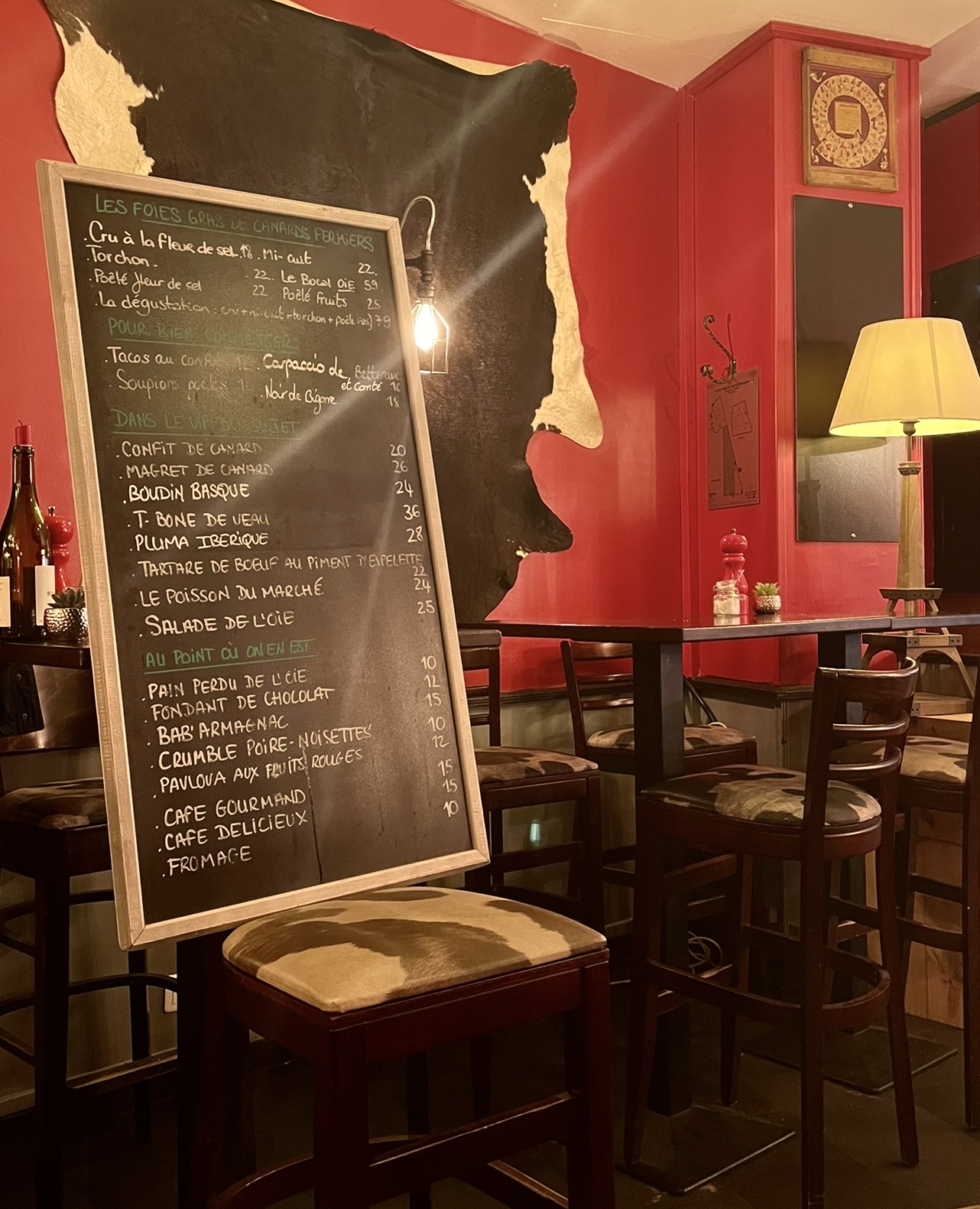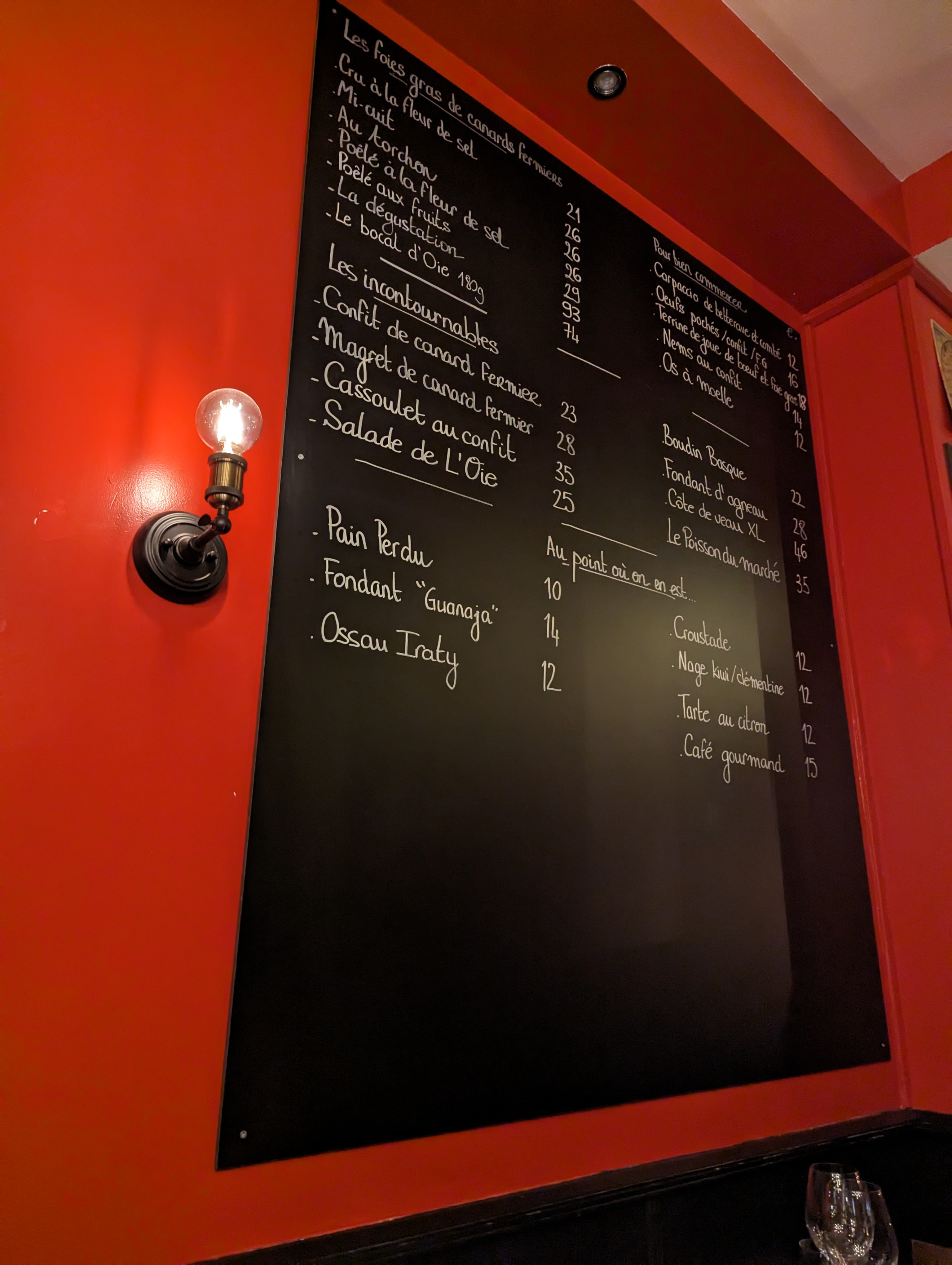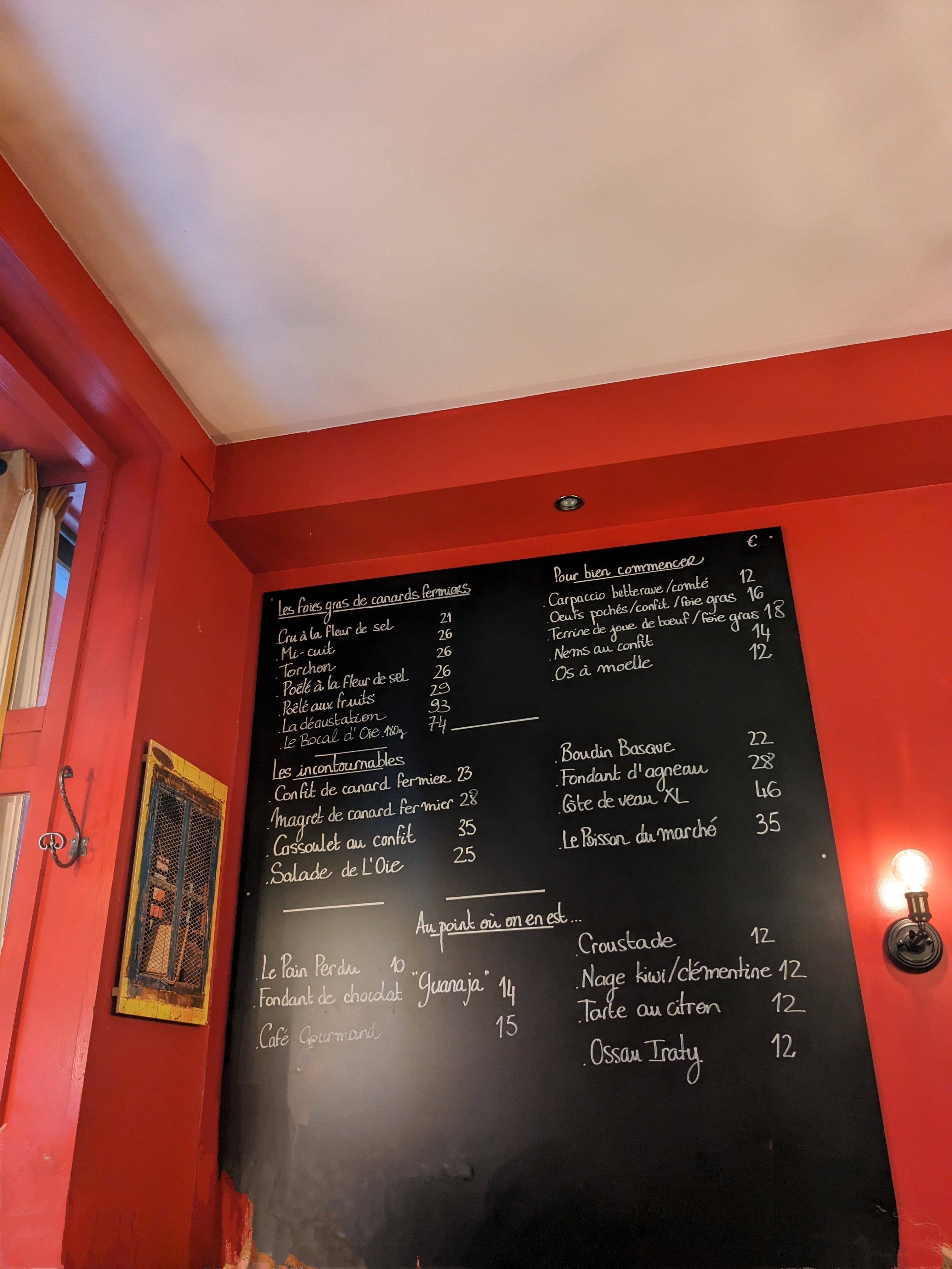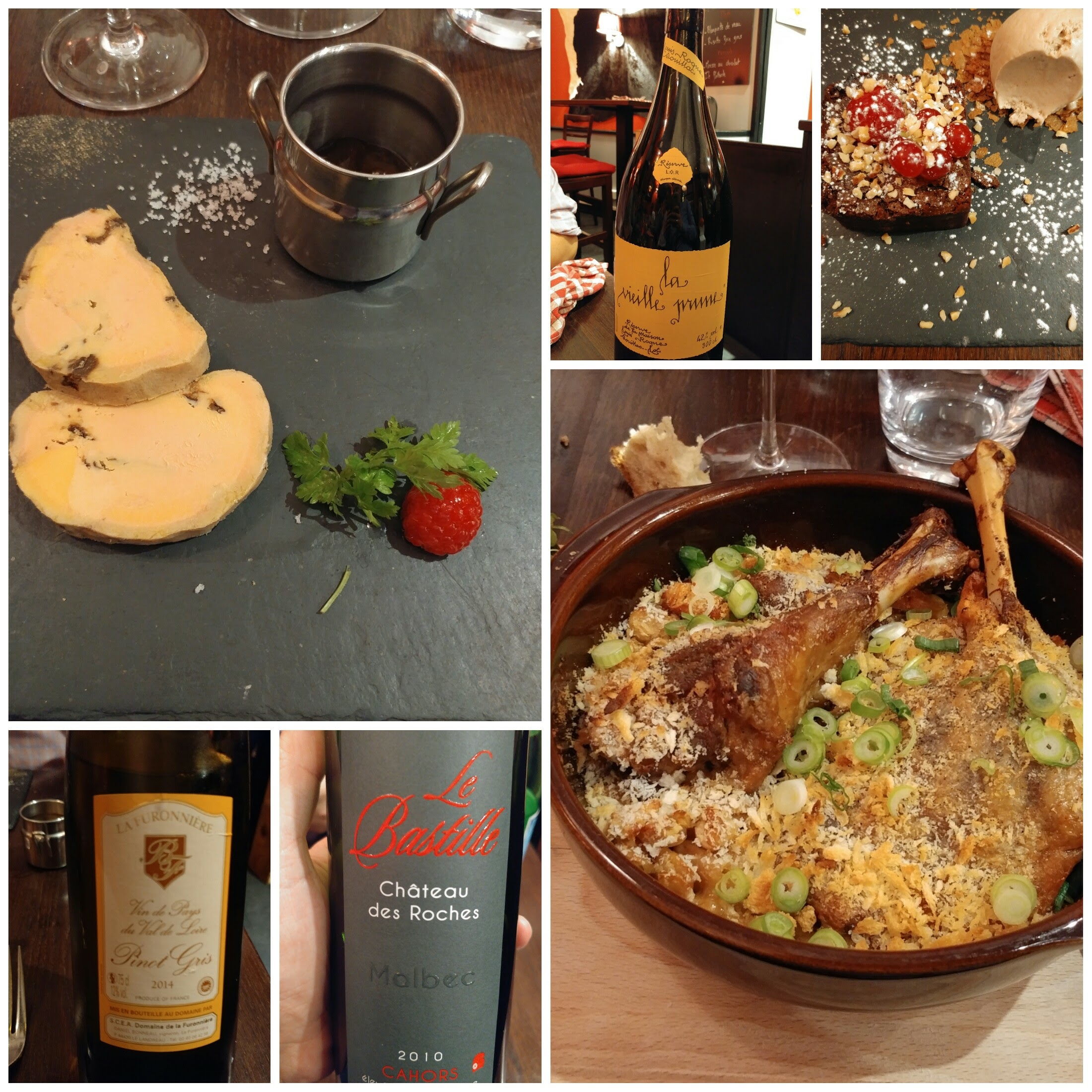 Le petit restaurant proposant les spécialités de Sud-Ouest comme le foie gras (cru, mi-cuit, poêlées), l'os à moelle, le magret de canard, le confit de canard, quelques salades, le hachis parmentier, quelques plats de poisson et j'en passe. Le menu était écrit sur une ardoise, donc sûrement les plats changent en fonction des saisons et la disponibilité des ingrédients. En tout cas le foie gras cru et magret de canard étaient excellents! Si ma mémoire est bonne, le foie gras était à 16 euros et 24 euros pour le magret. Je trouve les prix très raisonnables, compte tenu le fait que les portions étaient grandes et le plat bien présentés et préparés. En dehors de la cuisine, j'ai également apprécié le service qui était attentionné et rapide malgré le fait que le restaurant était complet très rapidement alors que je suis allée le soir en semaine (lundi). C'est un tout petit restaurant avec peu de tables. Il vaut mieux donc réserver. Un autre petit plus, c'est qu'ils disposent d'un voiturier et une excellent choix des vins, notamment les vins de Sud-Ouest. J'y retournerai!