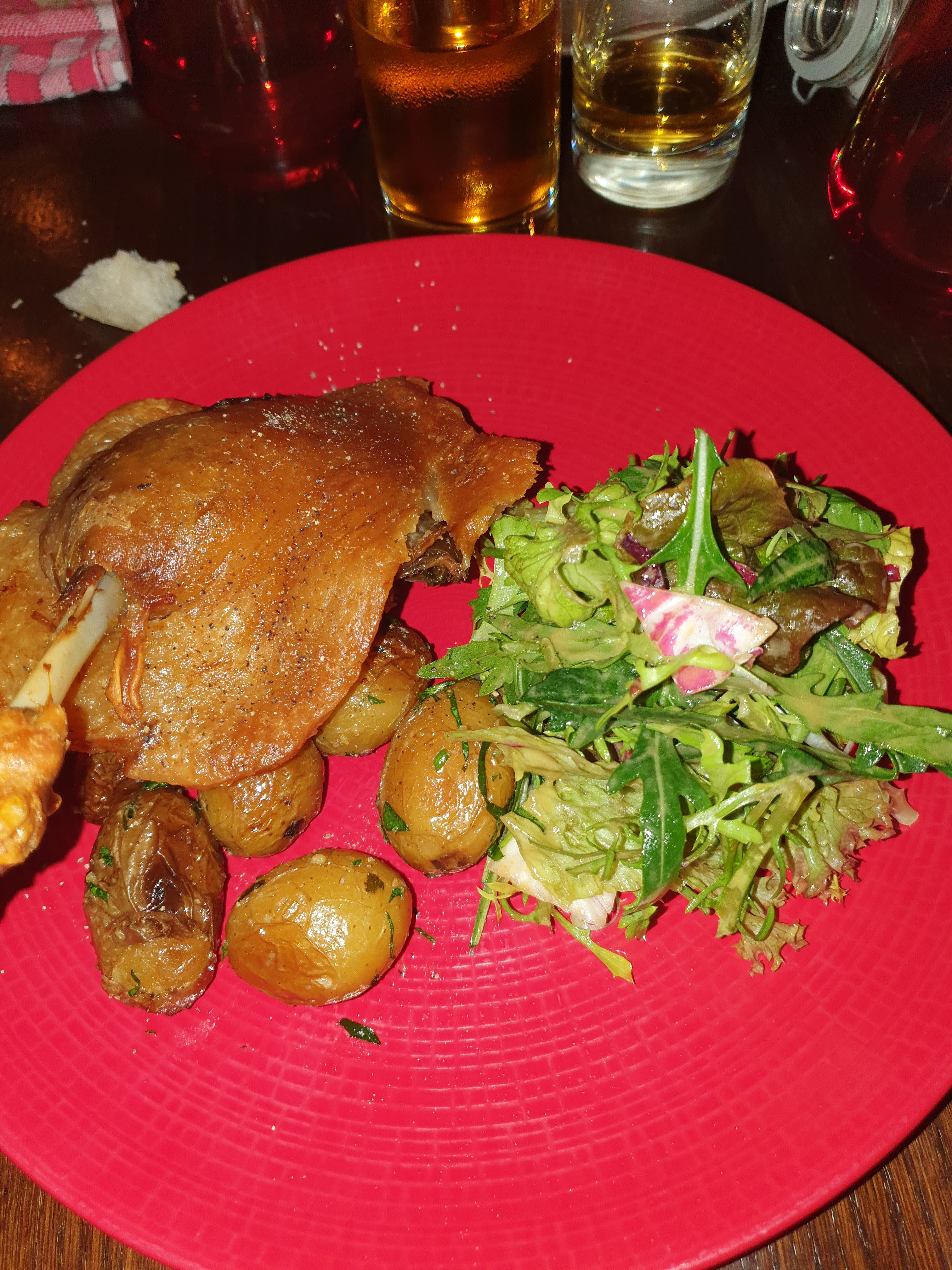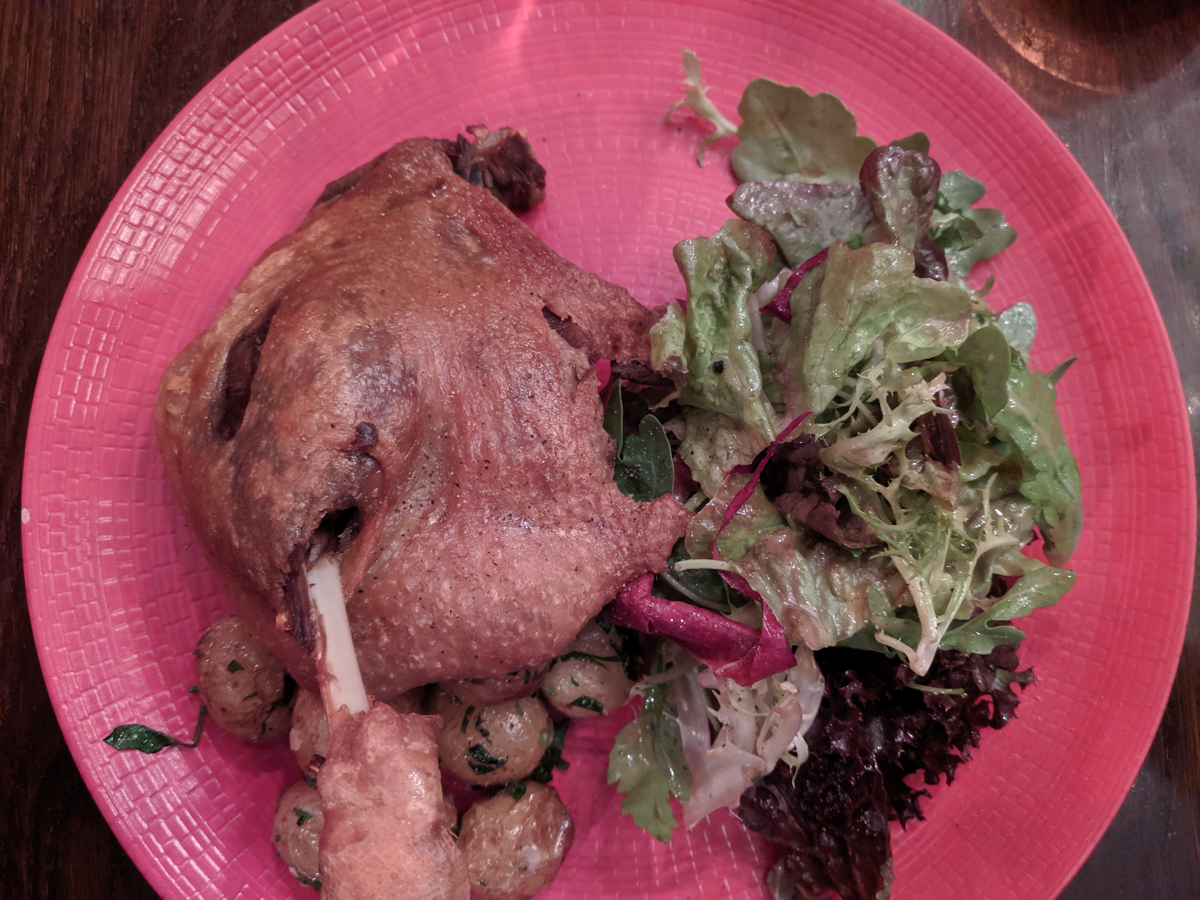 Nous avons dîné avec un ami, le service était assez lent! Au niveau de l'assiette : L'entrée : le foie gras manquait cruellement de goût, il avait oublié de nous ramener le pain grillé pour accompagner le fois gras nous avons attendu un moment puis avons mangé avec le pain Normal, Le plat nous avons testé à la fois le magret et le confit de canard : c'était bon, le magret manquait toute fois d'assaisonnement, les pdt fades et à peine tièdes. En somme c'était bon sans être renversant. La note est toutefois très salée!!