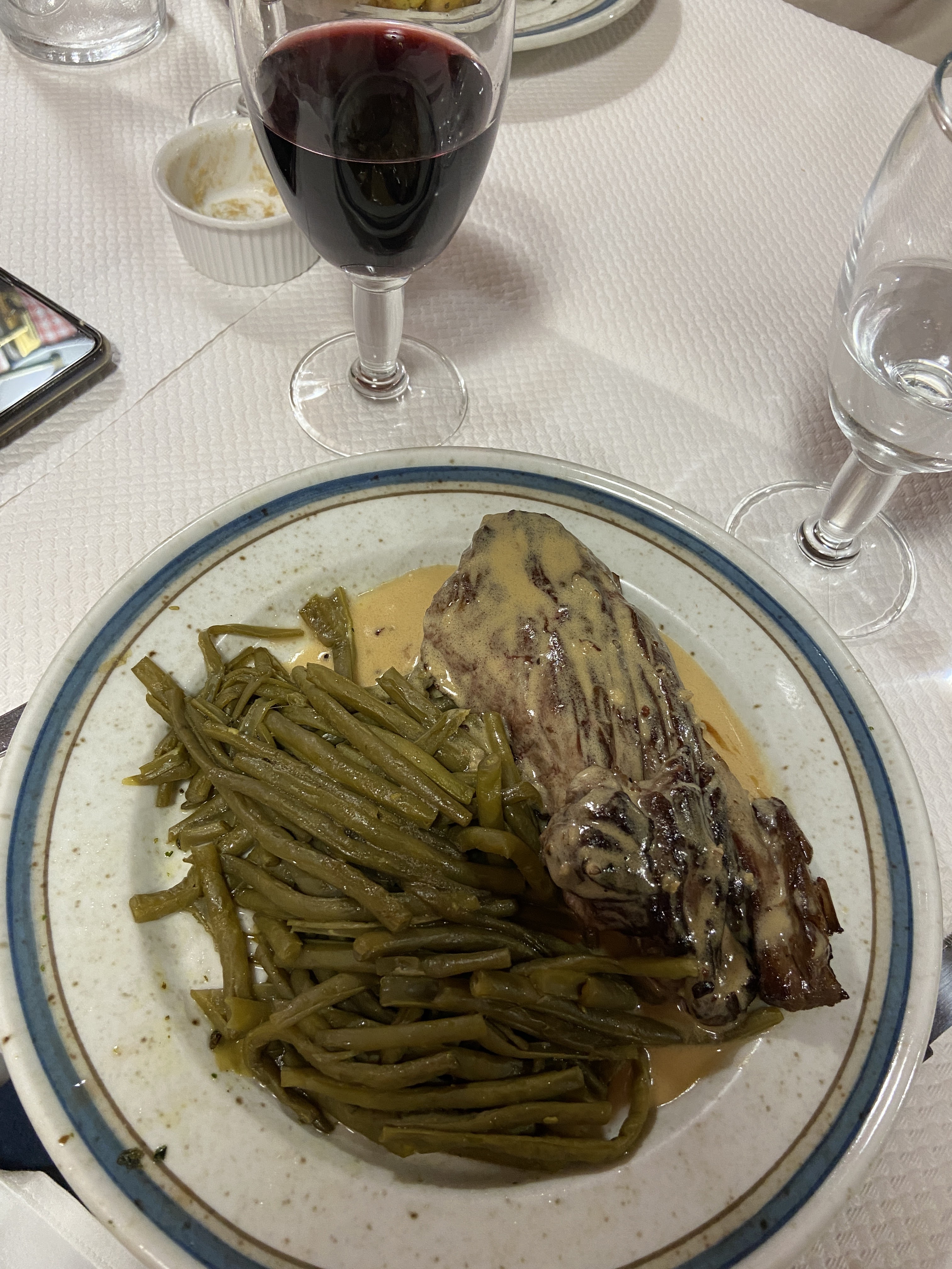 Nous étions un groupe de six personnes et un couple était français. Plusieurs d'entre nous ont commandé le steak au poivre, qui était excellent - - la sauce était particulièrement savoureuse - - le propriétaire dit qu'il ajoute du veau au bouillon. Les escargots étaient super, les haricots verts copieux, le cassoulet excellent. avec deux bouteilles de vin, la facture s'élevait à 64 euros par couple.